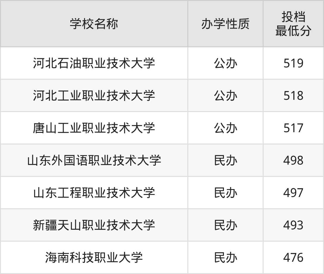 大数据与会计专业收分最高的大学是河北石油职业技术大学,2025年最低分519分,超高职本科线93分。分数线排名前五的大学还有:河北工业职业技术大学518分、唐山工业职业技术大学517分、山东外国语职业技术大学498分、山东工程职业技术大学497分。