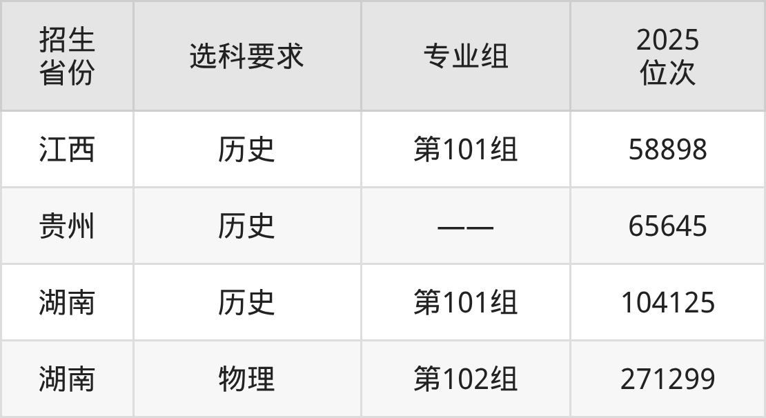 株洲师范高等专科学校2025年在全国各省的位次差异较大,最高位次是58898位(江西历史类)、最低位次是271299位(湖南物理类)。各省具体位次请看下图: